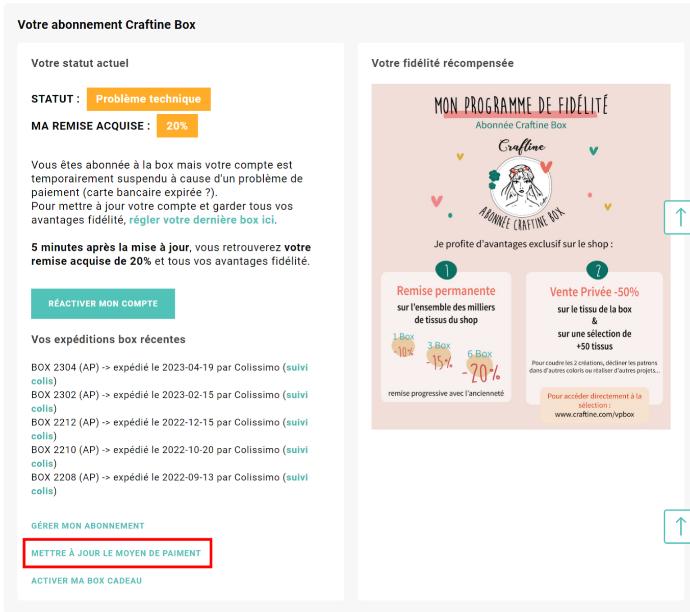 Afin de modifier votre moyen de paiement, il faut vous connecter à votre compte Craftine Box via le lien https://www.craftine.com/customer/account/ et de cliquer sur "METTRE À JOUR LE MOYEN DE PAIEMENT"